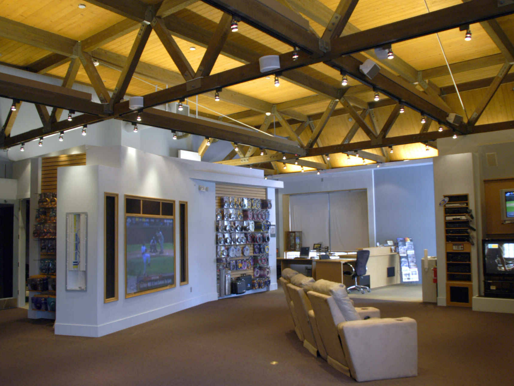 A building shell remodel and full tenant improvement for an Audio Video’s retailers 6,000 sf showroom. Uptown Audio Video displayed custom designed home theater systems in a comfortable, relaxed modern home environment. The build-out included lighting, custom built display cases and interior finishes. The existing wooden roof and ceiling were exposed and restored. Indirect lighting was installed and a series of display walls were added to partition the retail space and provide acoustic control to a series of home theaters. Rooms dedicated to showcasing the high-end audio equipment were designed to be built with full sound isolation at walls, doors and ceiling.